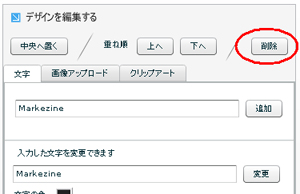 ちなみに、話が戻ってしまいますが・・・入力した文字を間違ってしまった場合には、商品作成ツール右サイドの「デザインを編集する」枠内にある【削除】ボタン(下記画像)をクリックすればいったん消去することができるようになっています。