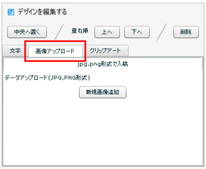 画像を使って商品化したい場合には、まず最初に商品作成ツールの「デザインを編集する」枠内にある3つのタブの中から「画像アップロード」を選択します。
