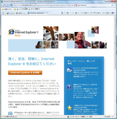 次期バージョンのIE8のβテスト版は「Internet Explorer 8 ホームページ」からダウンロードできる。