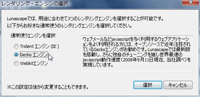 これまでもいわゆる「IEコンポーネントブラウザ」で、HTMLレイアウトをMozillaのGeckoに切り替えられる製品はあったが、Lunascape 5.0αではAppleのWebKitにも対応し、3エンジン切り替え可能となった。