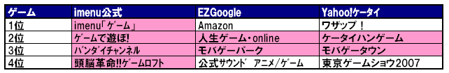 ドコモのiMenu公式検索では、キャリアが提供しているiMenu内のゲーム特集ページが1位に表示されているが、通常のキーワードではこのようにキャリアの提供しているページが上位に表示されることはほとんどない。ドコモでキャリアの提供ページが上位に表示されたのは、ゲームコンテンツに対するユーザーニーズが非常に高く、キャリア側がニーズに対応したゲーム特集ページを提供しているためと考えられる(他に、着うたなどを特集したiMenu「ミュージック」、動画を特集したiMenu「動画」に同様の例がある)。