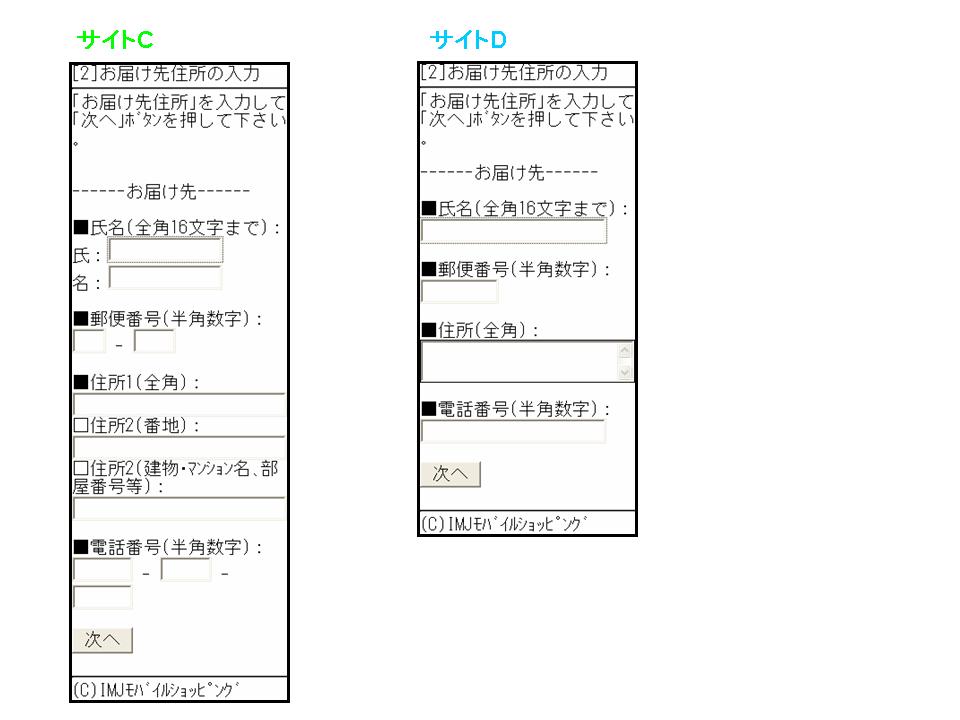 送付先の情報などを入力するページにおいて、フォーム設定の違いによるユーザーの印象の変化を調査するため、以下の2パターンのサイトC、Dを比較しました。