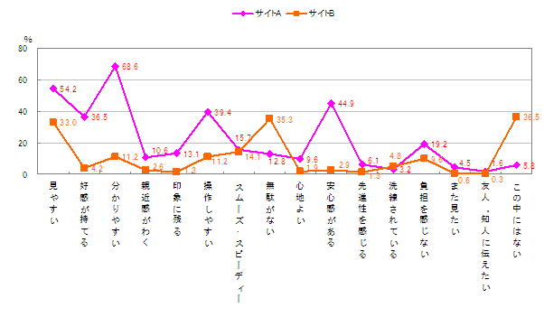 図 サイトA、Bの項目別イメージ比較(複数回答)【n=312】