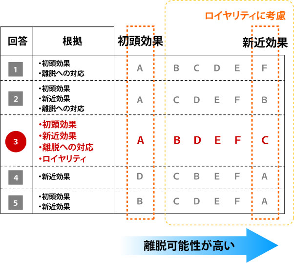 より正しい選択は「2」である。根拠を考えよう。何故、優先順位が高いAを前に持ってくるのか。単純な話である。メールマガジンを受け取った全員が最後まで見てくれるわけではない。メルマガの冒頭から離脱が始まるのだ。離脱されてしまうと「新近効果」は、全く機能しなくなってしまう。故に、ユーザーが離脱する前に優先順位が高い商品を我々は提示する必要があるのだ。それでは次に、比較対象を「3」と「1」に移そう。