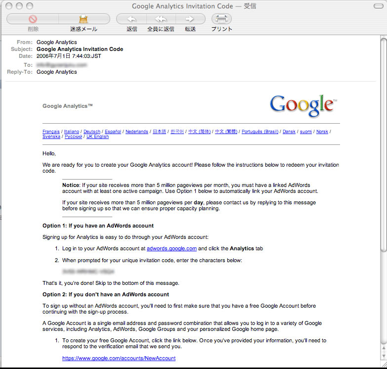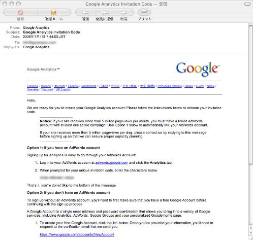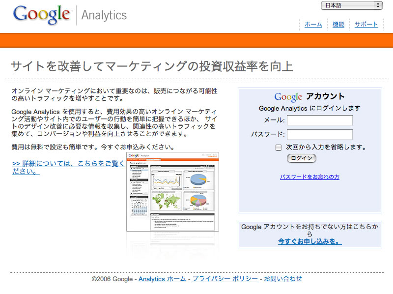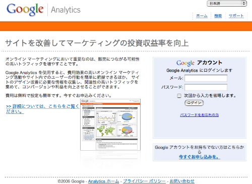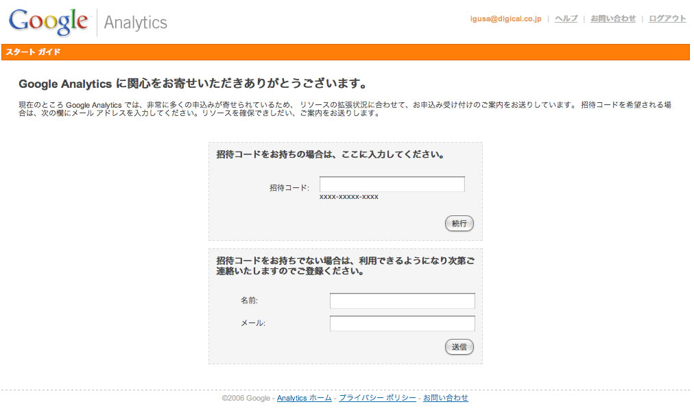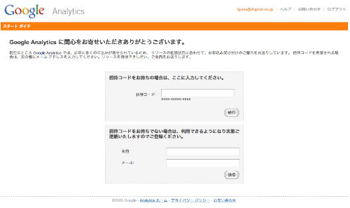 2006年7月現在、Google Analyticsは申込者過多により、順番待ちの状態となっています。ページ下部の入力エリアに、名前とメールアドレスを入力しておき、招待コードが届くのを待ちましょう。