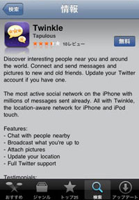小山 たとえば、この「Twinkle※」は、ある現場でつぶやくと、周りのつぶやきが見えてくるんですよ。「つぶやき」を共有する「Twitter」専用のアプリケーションなんですが、いま自分がいる場所の近くで、リアルには聞こないはずの他の人たちのつぶやきが聞こえてくる…不思議な感じでしょ。パソコン版もありますが、現場感が加わることで生まれる「見知らぬ人と場を共有しているという感覚」は、iPhoneならではのものでしょうね。