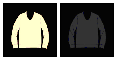 また、リープマン効果を逆手にとる工夫もある。『セパレーション効果』というものだ。図Aの「黒背景とダークグレイの商品」の境に明度差のある一色を入れる。そうする事によって商品の色がはっきりと分かり、また時として商品の良さを一層引き出すことさえあるのだ。下記イラストは全く同じ形で同じ色を配置した同一のモノなのだが、セパレーション効果を利用する事により、色や形、立体感など別の印象を受けるのではないだろうか?尚、下記2つの服の色は16進数のRGB値で#333333で全く同じ色である。
