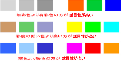 以上が誘目性を高める秘訣である。簡単にまとめるならば無彩色(白・灰色)等の背景に「オレンジ・赤・黄色」などの色を配置すると誘目性は極めて高くなる訳である。