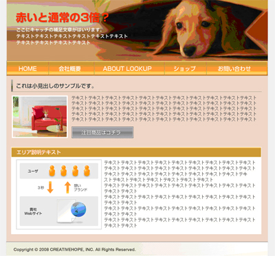 下記サンプルWebサイトの写真の横に「注目商品はコチラ」のボタンがあるが、この「注目商品はコチラ」ボタンを際立たせたい。誘目性を念頭において灰色の部分に何色を配置すべきか考えていただきたい。繰り返しになるが、誘目性とは複数の色がある中で、どれほど目を引くか(注目されるか)といった効果の高さを表す。背景によって誘目性の高い色は異なる。