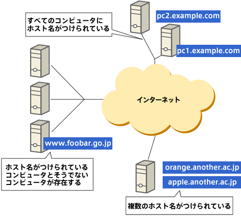なかにはホスト名がつけられていない、IPアドレスも存在しています。これはすでに述べたように、コンピュータが実際のやり取りに使うのはあくまでIPアドレスであり、ホスト名は人間がそのIPアドレスを管理しやすいようにつけた別名に過ぎないからです。