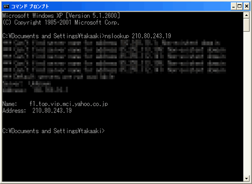 ホスト名とIPアドレスの変換にはDNS(ドメインネームサービス)という仕組みを利用します。DNSを提供するサーバにIPアドレスやホスト名を渡すと、対応するホスト名、IPアドレスを返してくれるという仕組みです。DNSのメインの仕事は、人間が入力したホスト名をコンピュータのわかるIPアドレスに変換することであり、ホスト名→IPアドレスの変換を「正引き」、その逆、IPアドレスからホスト名への変換を「逆引き」と言います。 通常はDNSを使った変換を手動で行うことはありませんが、Windowsマシンでもnslookupというコマンドで変換を行うことができます。 スタートメニューから「プログラム」→「アクセサリ」とたどっていき「コマンドプロンプト」を起動します。そして「nslookup」に続いてIPアドレスやホスト名を入力すると、DNSにアクセスが行われ、結果が返ってきます。
