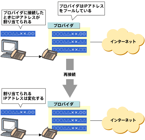 最もよくある例は、ADSLなどの電話回線を利用したプロバイダを利用しているケースです。こうした接続携帯の場合、プロバイダはあらかじめ利用可能なIPアドレスをプールしており、コンピュータが接続されるとそのなかから現在使われていないものを割り当てるというシステムになっています。これはつまり、接続を切ってつなぎ直した場合、前と同じIPアドレスになるとは限らないことを意味しています。