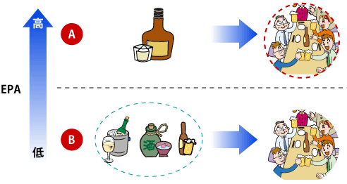 参考までに、下記の図を見てほしい。同量のお酒が飲める人に酔っぱらうまでお酒を飲んでもらった場合、Bの場合は3種類を飲酒しなければ酔えないのに対し、Aの場合は1種類の飲酒で酔うことができるとしよう。つまり、1回の飲酒における効果はAのほうが高いということになる。これを広告に置き換えると、Aは1回の広告施策で1アクションを発生させ、Bは3回の広告施策で1アクションを発生させたことになり、Bの方がEPAが高いと言える。