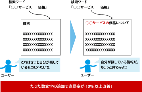 このような場合の改善策は簡単です。ページ側に該当文言を追加すれば良いのです。たったそれだけと思うかもしれませんが、数文字追加することによって直帰率が10%以上改善するケースも目にしてきました。