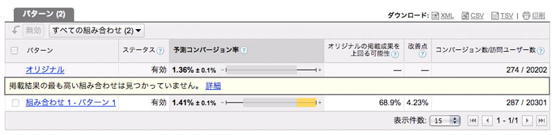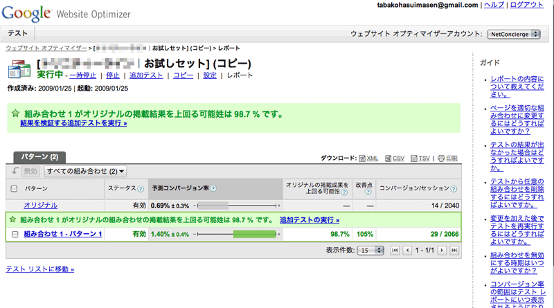テストを開始すると、レポートは随時更新されていく。ある程度のコンバージョン数が集まったタイミングでテストを終了しよう。筆者の経験からすると、それぞれのテストページでコンバージョン数が100を超えるか、来訪ユーザー数がそれぞれ1万を超えた当たりからテスト結果が安定してくるようだ。ただ、レポートはマメに確認して数値の動向は追っていた方がよいだろう。