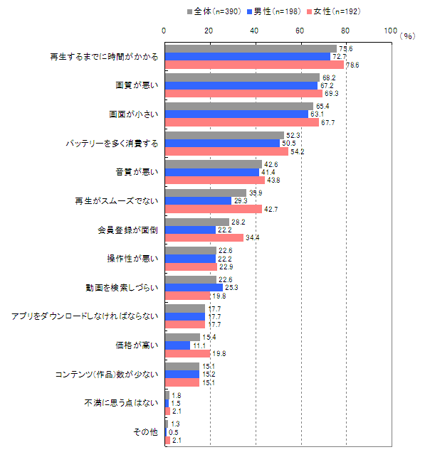 モバイル動画に対し不満に思っていることを尋ねたところ、最も多かったのは「再生までに時間がかかる」(76%)となり、次いで「画質が悪い」(68%)、「画面が小さい」(65%)となりました。