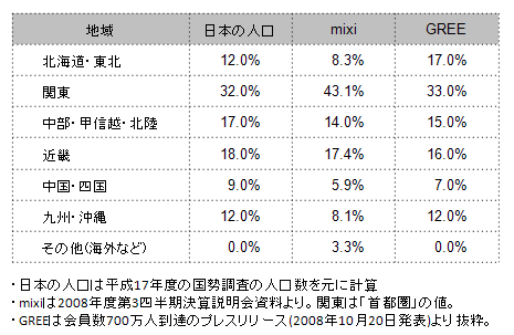 まずは地域属性を見てみよう。先に挙げた3つのSNSのうち、情報が公開されているmixiとGREEの地域属性、さらに日本全体の人口属性を比較してみると、ある特徴が見えてくる。mixiは関東(首都圏)が突出して多いのに比べ、GREEは日本の人口比率とほぼ同じ割合となっており、むしろ地方の比率が高い結果となっているのである。