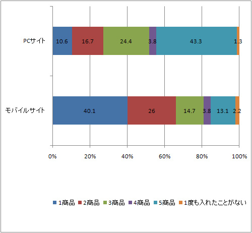 上のグラフは、コマースサイトで商品を購入する際、買い物かご(ショッピングカート)にいくつ商品を入れたことがあるかという調査の結果なのだが、これを見るとPCのコマースサイト利用者は5個以上入れたことがあるという回答が最も多いのに対し、モバイルコマースサイト利用者は1個しか入れたことがないという回答が最も多くなっている。