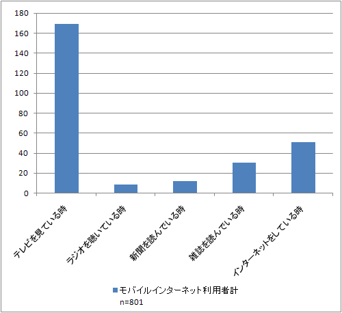 見てもらえば分かる通り、モバイルサイトが利用されているのは、「テレビを見ている時」が圧倒的に多いことが分かる。先の結果と合わせると、モバイルサイトの利用者は「自宅でくつろいでいる時に、テレビを見ながらのんびり使うことが多い」ということになる。