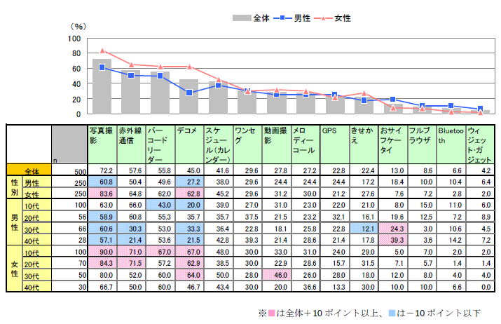 多くの機能で女性の利用率が男性を上回っており、「デコメ」の差が最も大きく、次いで「写真撮影」、「赤外線通信」となりました。