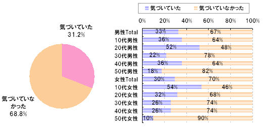 Q3-(1)では「ユニバーサル検索」機能について説明し、検索結果に画像や動画が表示されていることに気づいていたかを尋ねたところ、「気づいていなかった」が68.8%で多く、70%のユーザーは検索結果にユニバーサル検索結果が表示されていることに気づいていないことが分かった。
