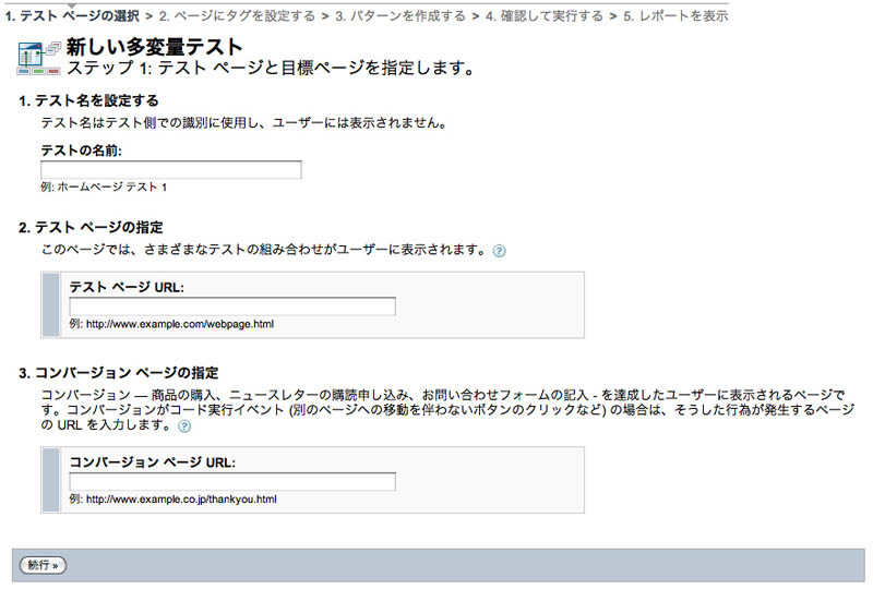 今回は、Webサイトオプティマイザーの導入部分については割愛する。まだ当ツールを一度も利用したことがない場合は前回コラムを参照いただきたい。登録画面でA/Bテストと同様の項目を入力して次に進む。