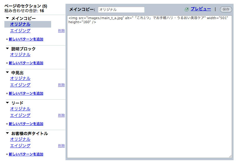 指示どおりにタグを挿入したら、検証ボタンを押して正しく反映されていることを確認する。問題が無ければ次へ進めるようになる。多変量テスト独特の、出し分け要素の登録画面だ。もともとHTMLファイル内に記述しておいた要素は「オリジナル」という名称で自動的に登録されている。ここで事前にテキストファイルに記述しておいた表示要素をそれぞれ登録していこう。