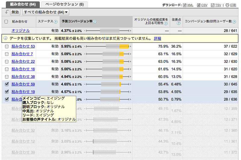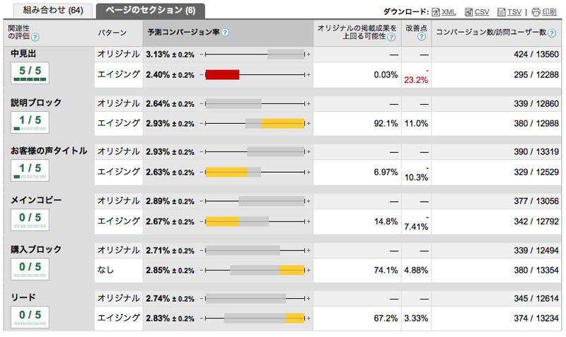 多変量テストではこの他、ページのセクション別レポートも確認できる。これがなかなか面白い。