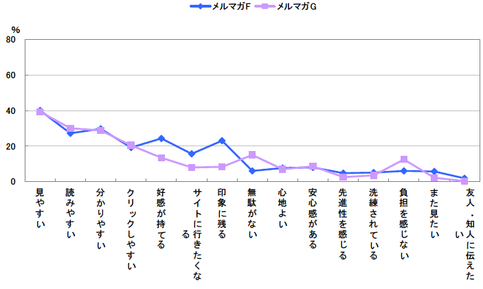 各項目においてほとんど差のない結果となっていますが、「好感が持てる」、「印象に残る」、「サイトに行きたくなる」という項目においてメルマガFがメルマガGを上回りました。大きな画像を利用したメルマガの方が、好感が高く、印象に残り、サイトへの訪問意向も高い結果となりました。