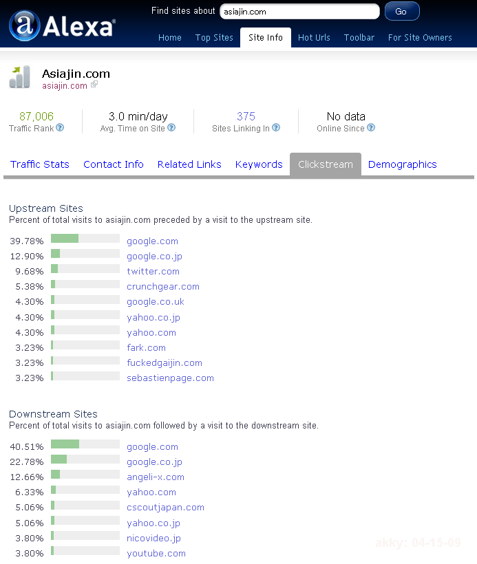 クリックストリームのページでは、そのドメインに訪れた人が、サイトに来る前とサイトから去った後にどのドメインのページを閲覧したか、という情報が分かります。Upstream Sites(上流サイト)は、今調べているドメインに来る「前」にユーザーが見ていたドメインが、ユーザー数の多い順に表示されます。