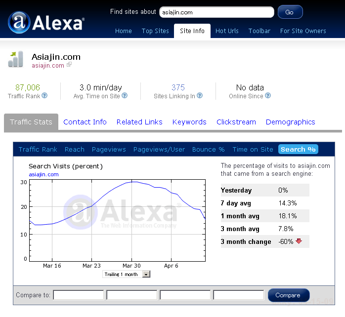 3つ目の新機能は、Traffic Statsメニューの中のサブメニュー、1番右側にある"Search %"で開くことができます。ここでは、検索エンジンから来たトラフィックの割合の変動をグラフで見せてくれます。過去のどれぐらいの長さについて見るかは、下部のプルダウンで選択できます。検索エンジンからの流入は、絶対数ではなくアクセス全体に対する割合(パーセンテージ)である点には注意してください。