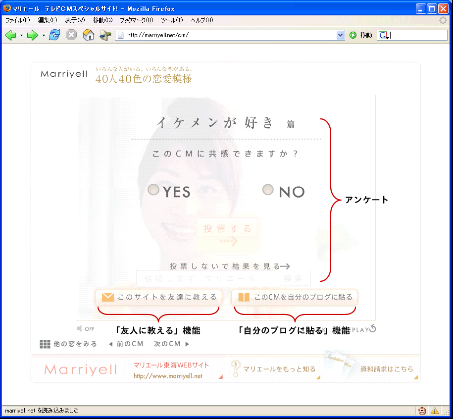 マリエール東海の場合は、「自分のブログに貼り付ける」機能を提供していることからわかるように、ブログに貼り付けてもらうことを想定しながら一連のプロモーションを制作したのでしょう。「タレントを使わない、BGMも使わない」ようにして権利関係への配慮を強く感じます。