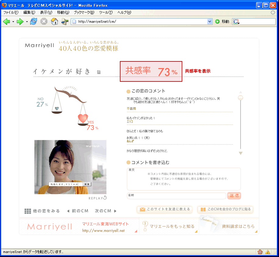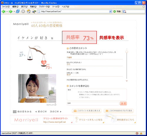 さらに「このCMに共感できますか?」というアンケートをビデオクリップの最後に表示させています。Yes/Noで回答すると、下の画面にあるように共感率が表示される仕組みです。