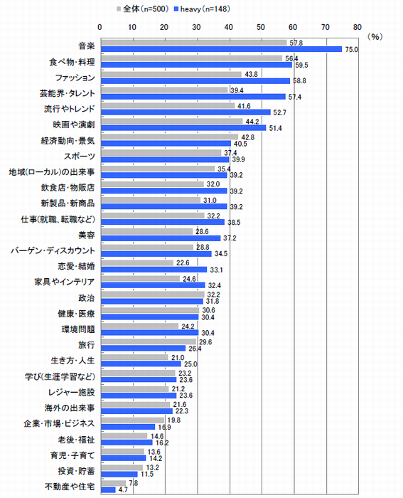 普段関心のある情報について尋ねたところ、「音楽」(75%)が最も高く、次いで「食べ物・料理」(60%)、「ファッション」(59%)となりました。様々な情報に対して関心度は高く、広く情報に接していることが推察されます。