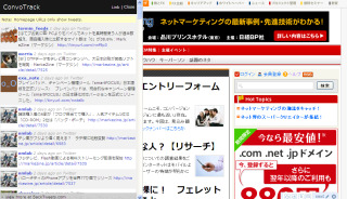 ConvoTrackのブックマークレットをブラウザにインストールしておいて、チェックしたいサイトを開いた状態でそのブックマークレットをクリックすると、画面の左にTwitterユーザーのつぶやき(とリンク)がタイムラインで表示される。ボクのこのコラムもリンクしてもらえるとウレシイな(とか、言ってみたり)。