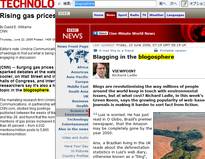 海外ではニュースなどで、「ブロゴスフィア(blogosphere)では○○のように」などと紹介されることがある。このブロゴスフィアとは、簡単に説明すればブログの集合体をイメージしてもらえればわかりやすい。私たちの発した、感情や意識、情報の集合体である。そして、例えばCNNやBBCなど海外の大手ニュースなどでは既に「このブロゴスフィアでは、このような意見が活発である」などと使われているのだ。