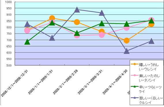 2009年5月時点では「辛い」といったネガティブなワードの発言数が高ポイントを得ているものの「楽しく・嬉しい」状況であったと言えるのではないだろうか。