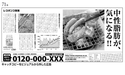 逆に71の広告はデザインとしては70の広告に劣りますが、読みやすいしっかりとしたスミ文字で、広告の頭の部分に「中性脂肪が気になる!!」という強いキャッチコピーがしっかり目立つように入っているので、目にした通行人(特に中性脂肪が気になっている層!)は思わずビクッとして立ち止まるはずです。