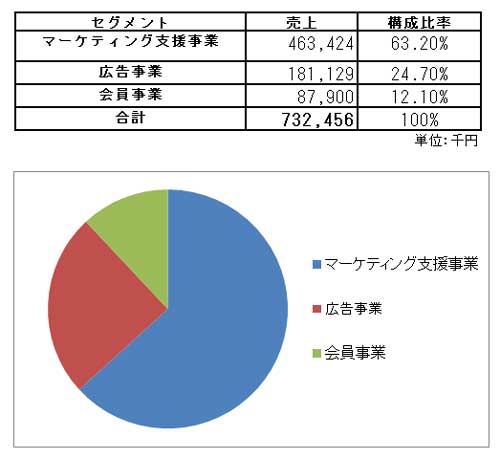 セグメント別に第12期(平成21年1月期)の売上構成を見てみると、マーケティング事業が463,424(千円)、広告事業が181,129(千円)、会員事業が87,900(千円)となっており、売上の実に60%以上がマーケティング支援事業から成り立っていることがわかる。