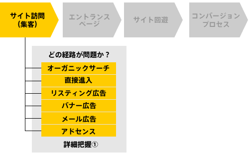 まず、ボトルネックはリスティング広告なのか? バナー広告なのか? サイトへの直接進入なのか? を把握する必要があります。