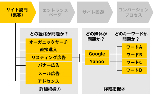 ボトルネックとなっている流入経路がわかったら、その経路をさらに詳細に分けて問題点を探ります。問題点はバナー広告の中の、どのキャンペーンのどの媒体か?、リスティング広告の中の、どの媒体のどのワードか?、を把握します。