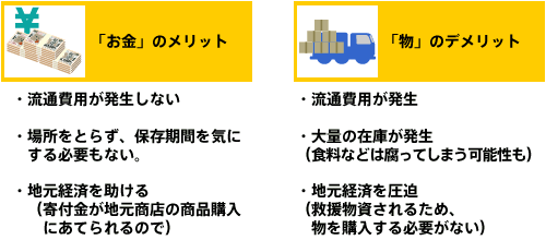 なぜモノは駄目だがカネならいいのか。第一に、モノには流通費用がかかるが、お金ならかからない。長岡への救援物資は10トン トラック450台で運び込まれたそうだ。流通費用が高そうだ。そんなトラックが道をふさいでいたら、一般の車にとってはさぞや迷惑であったろう。道も痛みそうだし。でも、お金なら、電子送金なので、その心配はない。