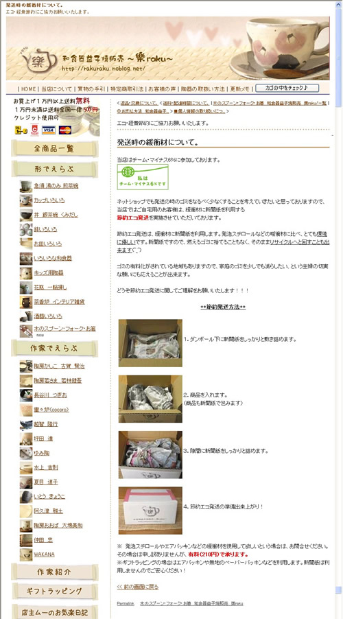 ここまでエコ発送についてお話しているのですから、当店がエコ発送していなければお叱りを受けてしまいますね。「楽raku」で扱っている商品は、陶器でワレモノですが、もちろんエコ発送を実施しています。サイト上で「節約エコ発送にご協力ください」と謳ったり、ご購入くださったお客様に許可を頂いて、ご自宅用に限り、緩衝材に新聞紙を利用させていただいています。下のWebサイトでは新聞紙などを利用した発送の手順を説明していますので、参考にしていただければ幸いです。