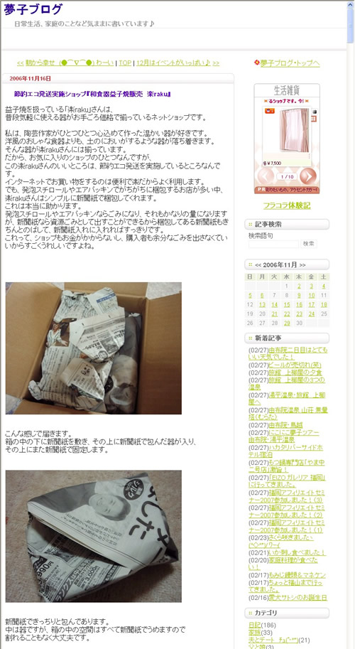 こう考えると、アイデア次第でエコ発送はショップのブランドイメージ向上に繋がります。意識が高いとお客様から高評価をいただき、信頼できるショップだと思っていただければ、リピートにも繋がります。楽rakuにしても、開店当初から節約エコ発送を実施していますが、エコ発送に関してクレームを受けたことは一度もありません。逆に「ゴミが出なくていい」と、お客様に喜んでいただけています。共感してくださったお客様が、ご自身のブログに感想を書いてくださった時は、とてもうれしく思いました(ブログの掲載許可をいただいたのでご紹介します)。