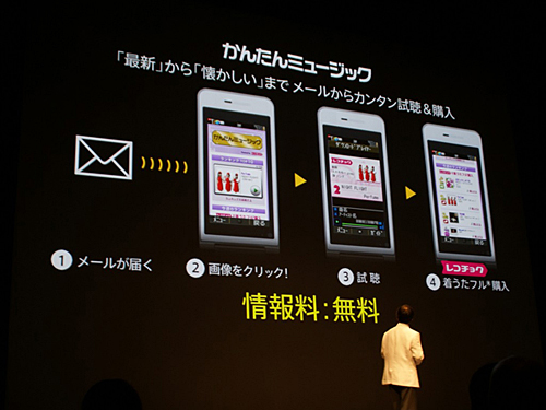 一例として、ソフトバンクモバイルの“かんたんミュージック”を挙げてみよう。これは、メールで配信されてくる音楽情報を元に、楽曲を視聴したり、購入したりできるというサービスである。