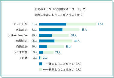 次の問いでは、指定検索キーワード広告を見たことある広告メディアのそれぞれについて、その後実際に検索に至ったかどうかを尋ねた。