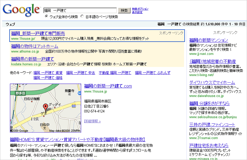 キーワード「福岡 一戸建て」で検索した際の表示結果