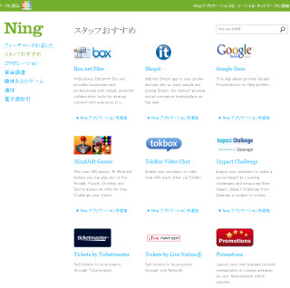 例えば、UstreamやTokboxやBlogTaklRadio、(以前にも書いた)ShopitやCartflyの他、HuluやBox.net、Zoho、さらにはGoogleDocsにまで対応していて、まったく選ぶのに目移りする。このことひとつをとってもNingの至れり尽くせり振りがよく判る。