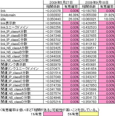 上記10個のキーワードをYahoo!で検索した際の上位50件につき、以下の項目を作成。2009年5月27日および2009年9月18日に取得したデータを分析しました。IPに関してはclassA~Dに分解して分析を行っています。
