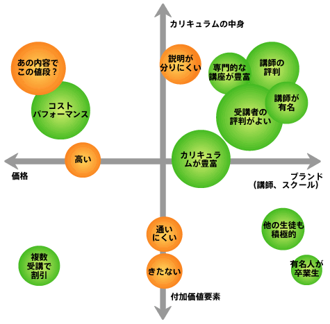 たとえば、自社が事業展開する市場に関する、ブログやSNSの「顧客の声」を集めて、下記のようなバブルチャートをつくることも可能でしょう。以下に示すのは、ビジネススクールに関する期待や評判をバブルチャートとして集計したもののイメージです(これはあくまでイメージであり、実際の調査はしていないのであらかじめご了承ください)。